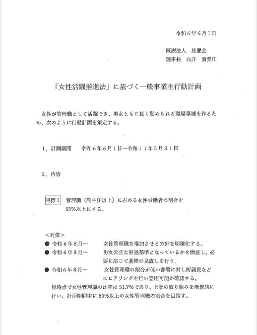 当院では、職員が仕事と家庭を両立しながら働ける環境をつくるための取り組みとして、下記のとおり行動計画を策定しています。