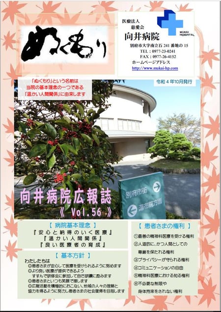 私たちは病院関係者だけではなく、地域住民の方たちとも温かい人間関係を築きたいと願い、広報誌の名前を「ぬくもり」としました。